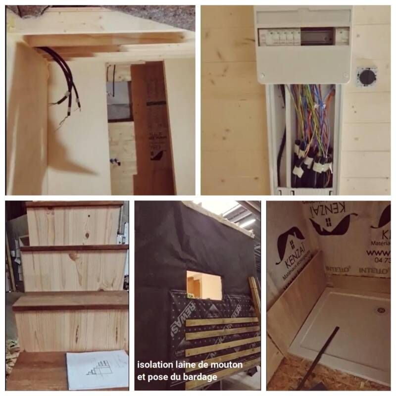 Le projet est dans les temps, nous avons fait le choix des luminaires, l'électricité est tirée sur toute la tiny, installation du bac de douche, construction des toilettes sèches en cours et de l'escalier, préparation du bardage...